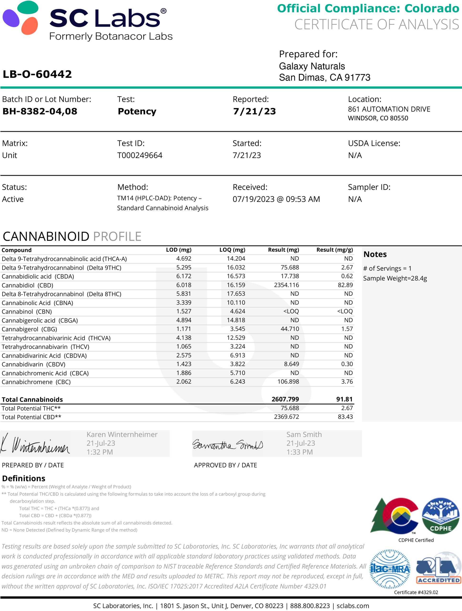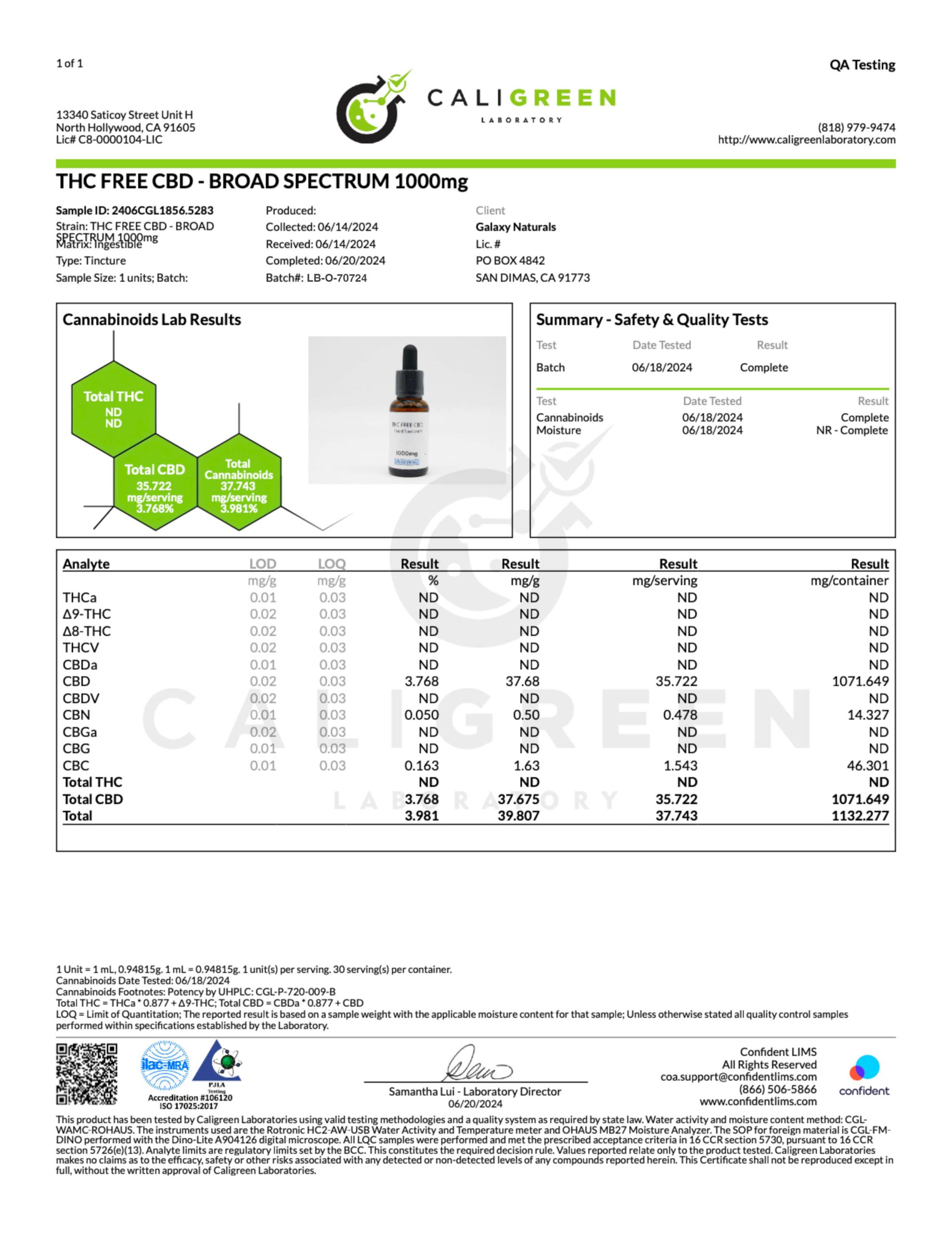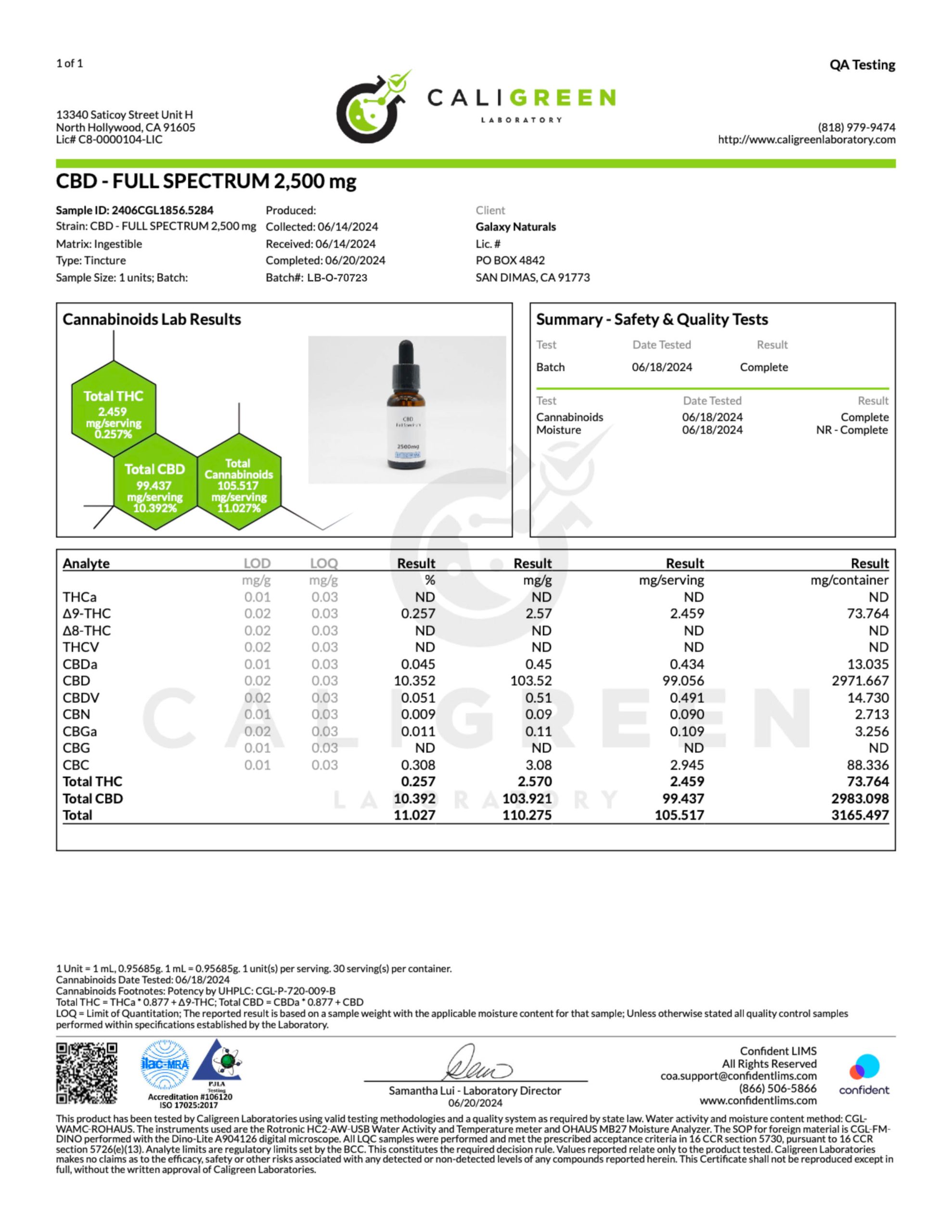 Below are lab reports. Different strengths may have the same lab report. Lower strengths were derived from higher strengths. This was achieved by adding Organic MCT oil to the original batch strength. Please feel free to contact us for any additional lab reports via support@galaxynaturals.com
